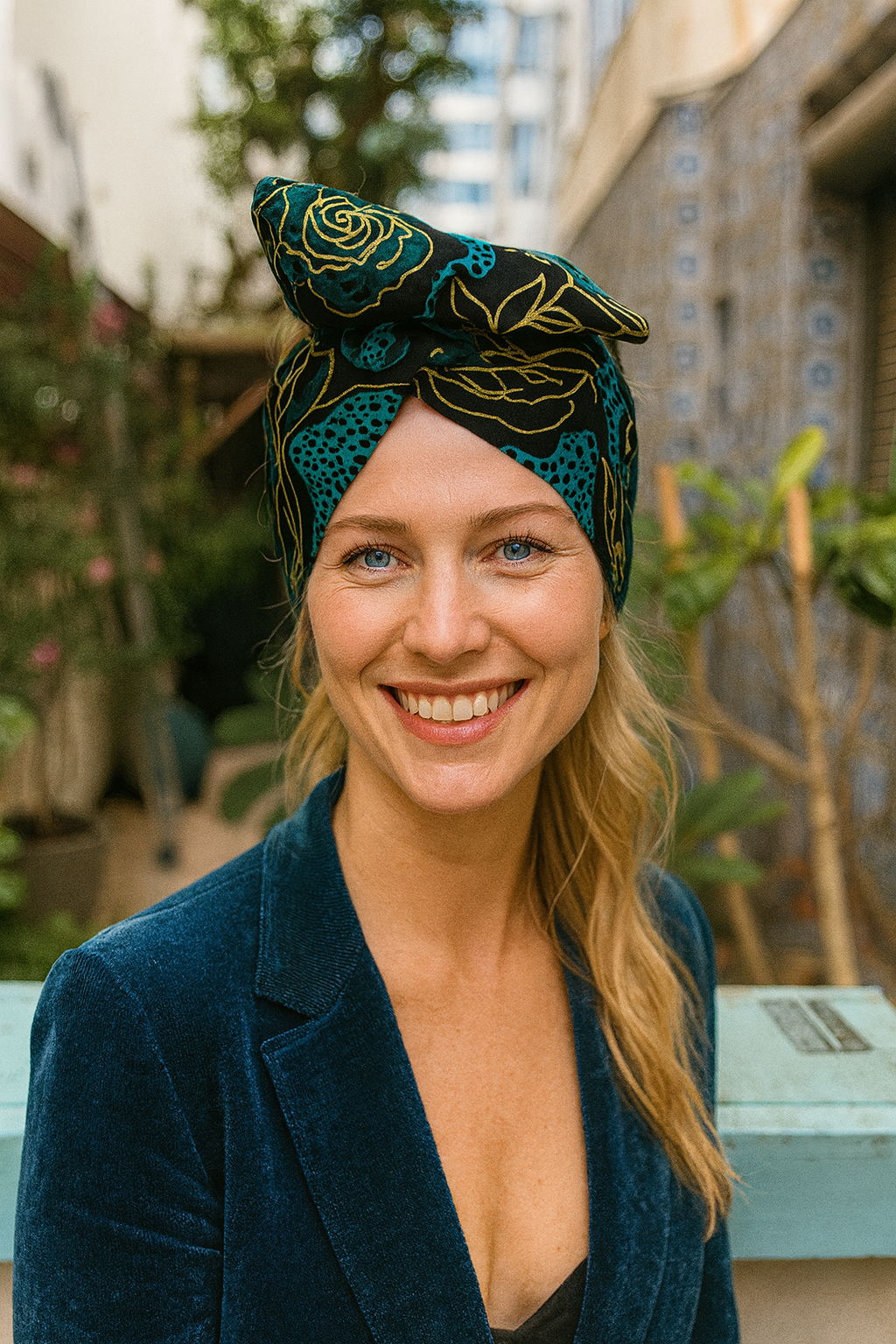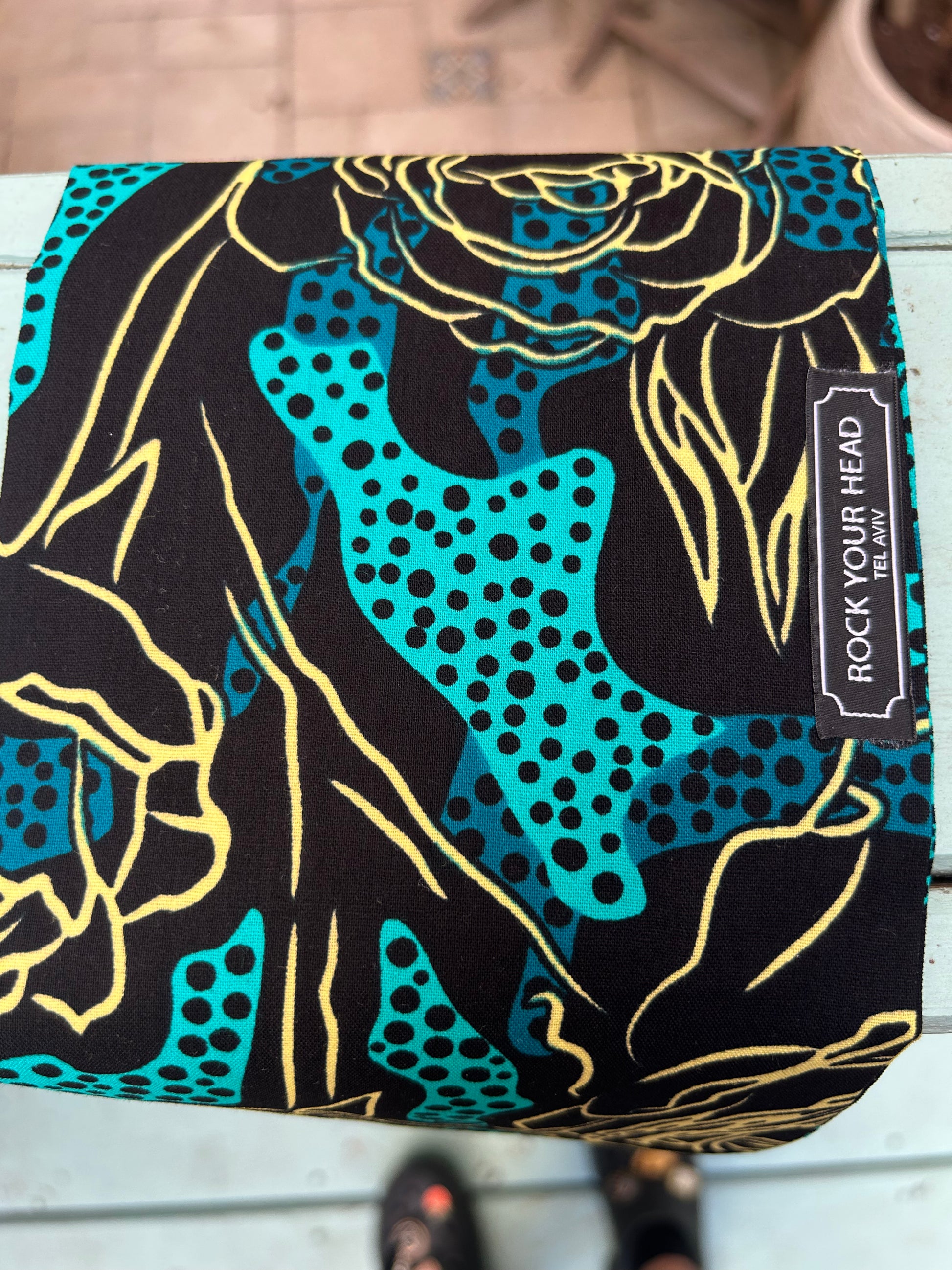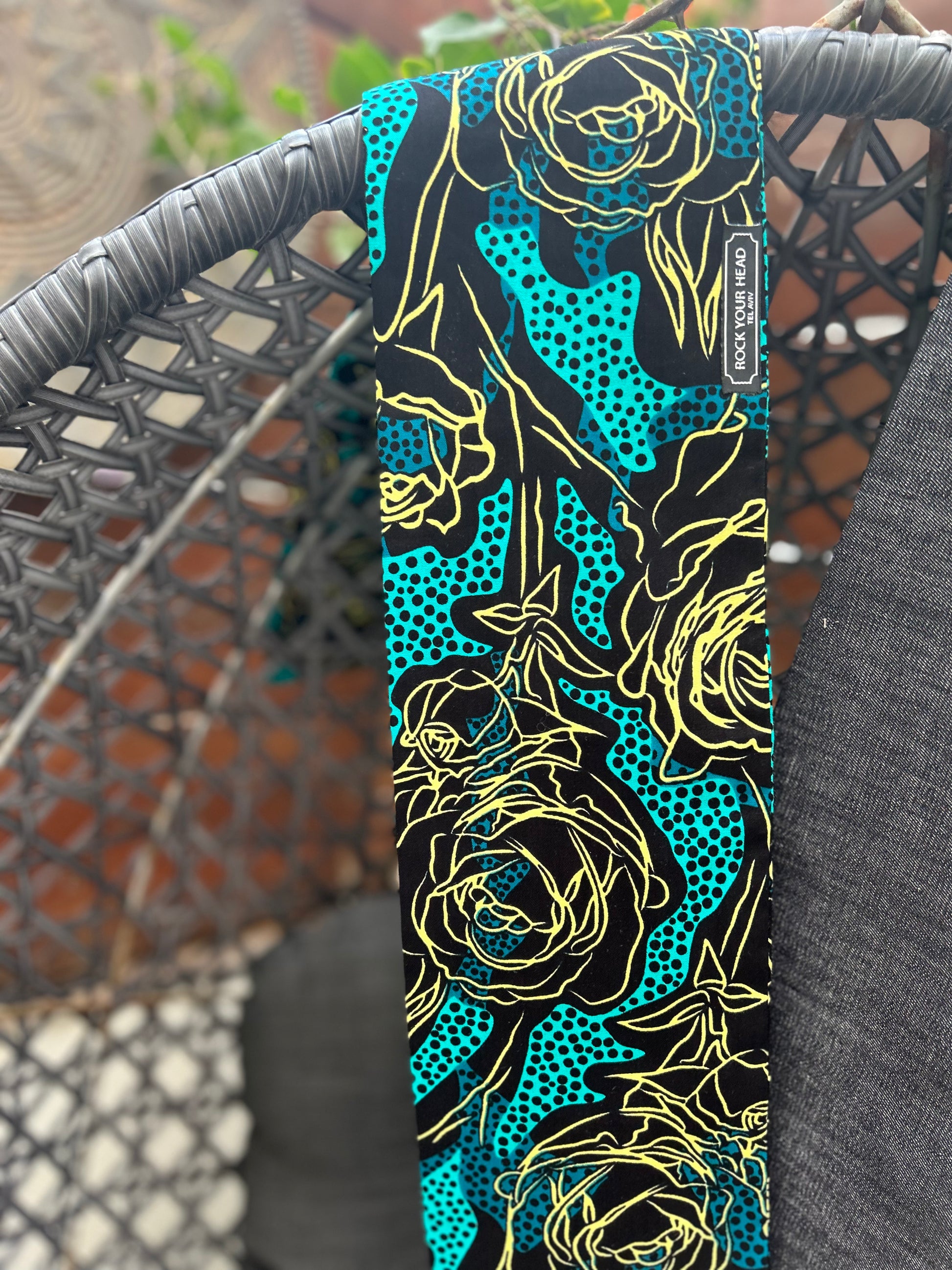 Exprimez votre style avec ce headband flexible unique , conçu dans un tissu wax africain 100% coton de haute qualité turquoise , bleu lagon et noir, sublimé par de grandes roses jaune au tracé artistique.