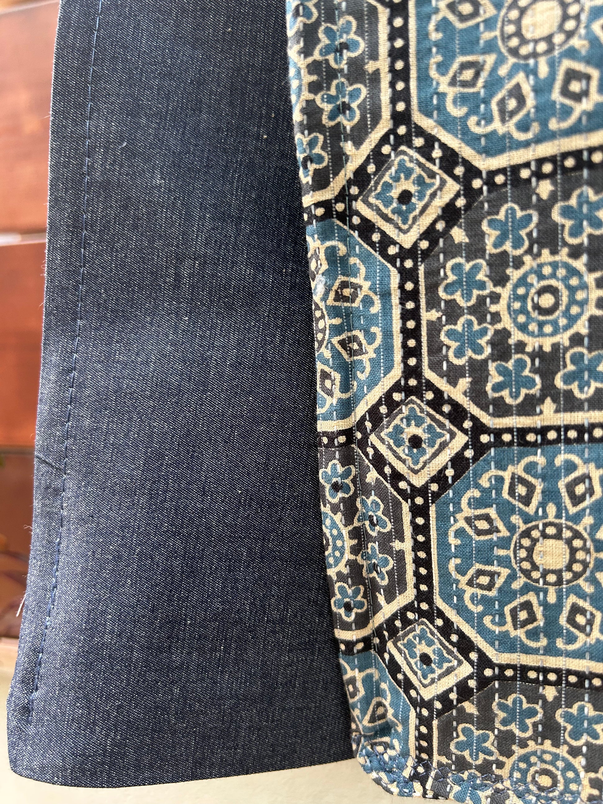 • Côté 1 : Motif Mosaïque Indigo , marine , banc , chic et détaillé, pour une touche bohème et élégante.