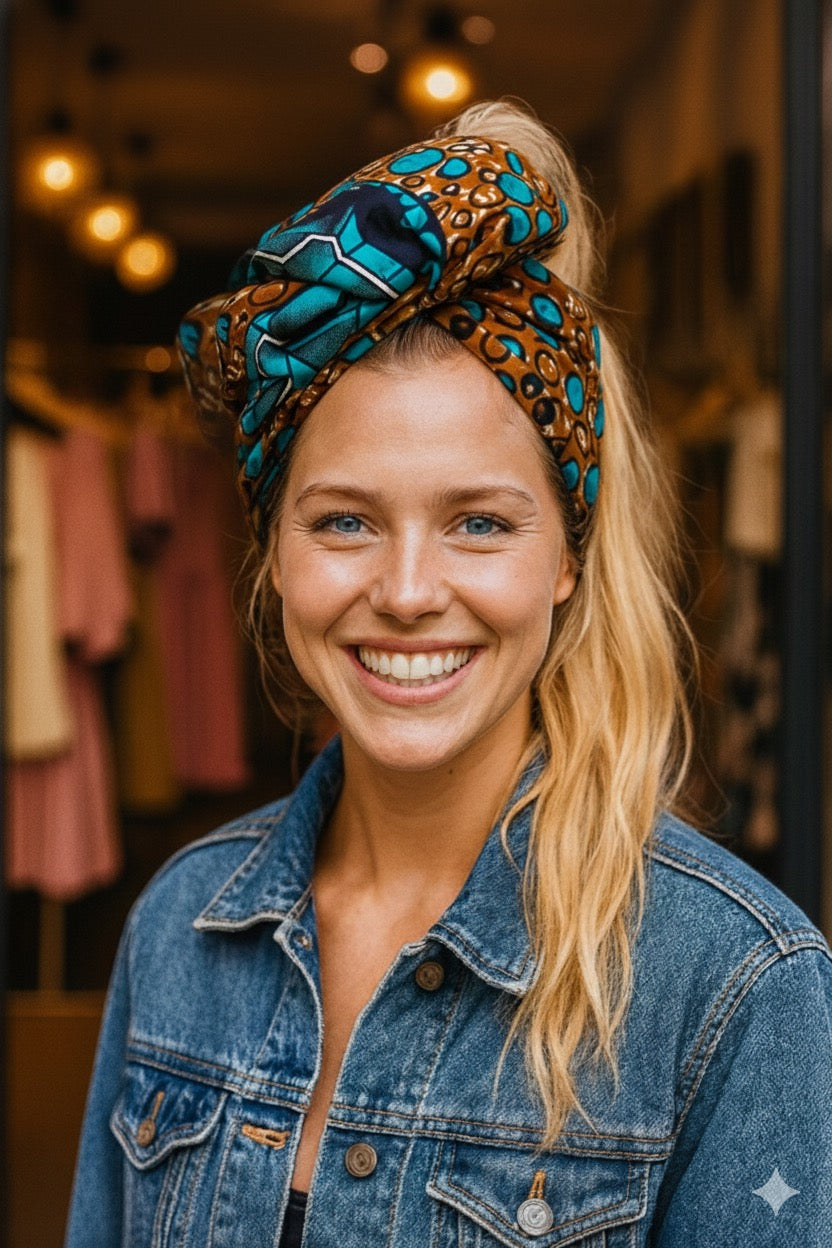 Its circular and star-shaped patterns, in beautiful shades of turquoise blue, chocolate brown, black, and cream, reflect the elegance of traditional African fabrics. A statement accessory full of character, perfect for expressing your style with authenticity and softness.