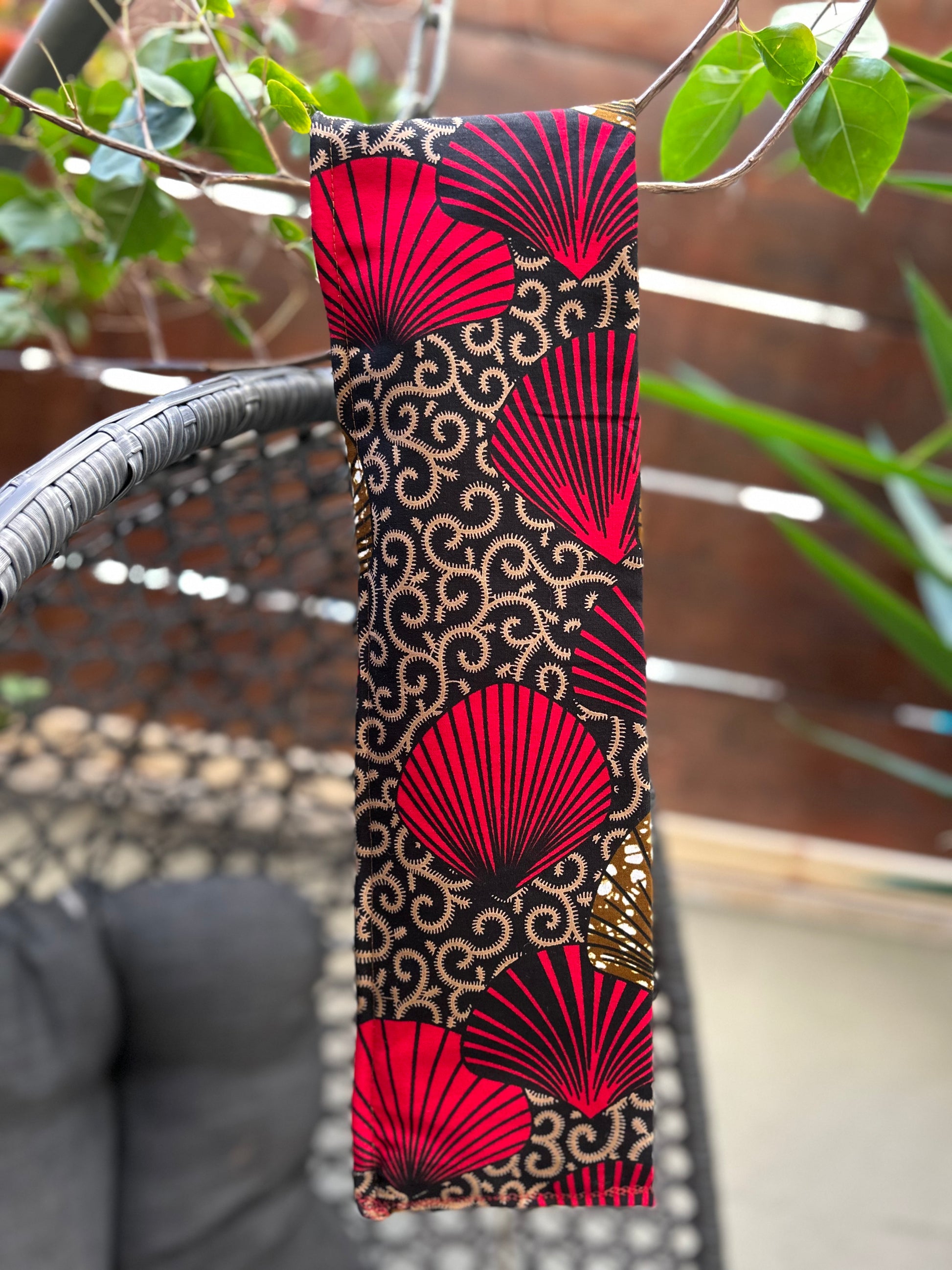 l'accessoire parfait pour un look audacieux. Ce tissu de qualité présente un motif vibrant d'éventails rouge sur un fond noir intense, rehaussé de volutes marron pour un effet chic et opulent.