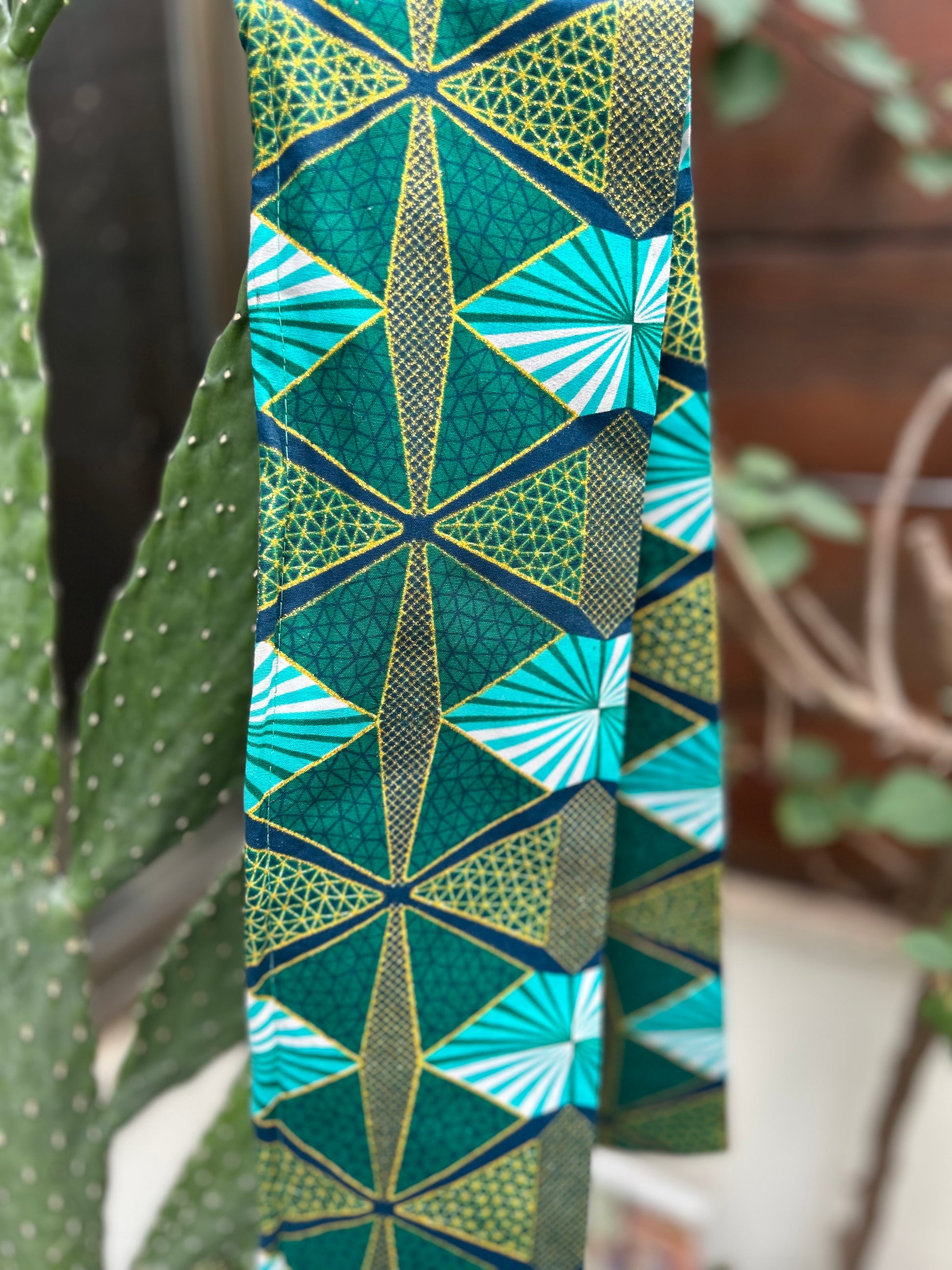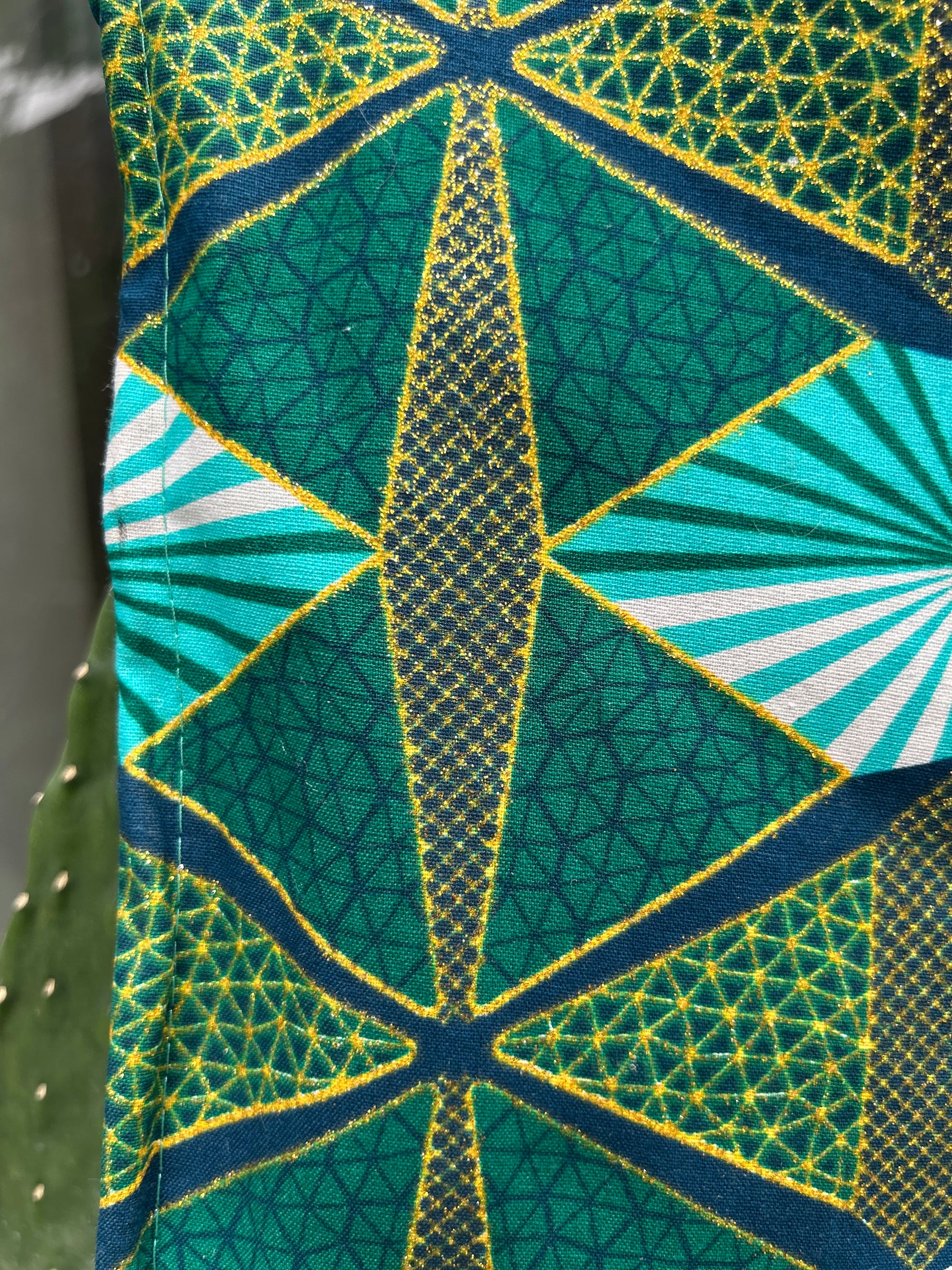 Dominé par des nuances profondes de vert émeraude et de turquoise, il est subtilement rehaussé de fils de lurex dorés qui captent la lumière à chaque mouvement. Un accessoire audacieux qui transforme instantanément n'importe quelle coiffure.