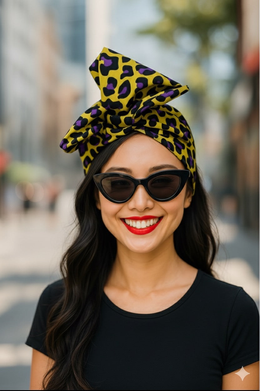 Make a bold style statement with our flexible headband featuring the iconic leopard print, reimagined in a striking combination of vibrant yellow and deep purple. This timeless, essential accessory is perfect for adding a touch of unique character to any outfit.