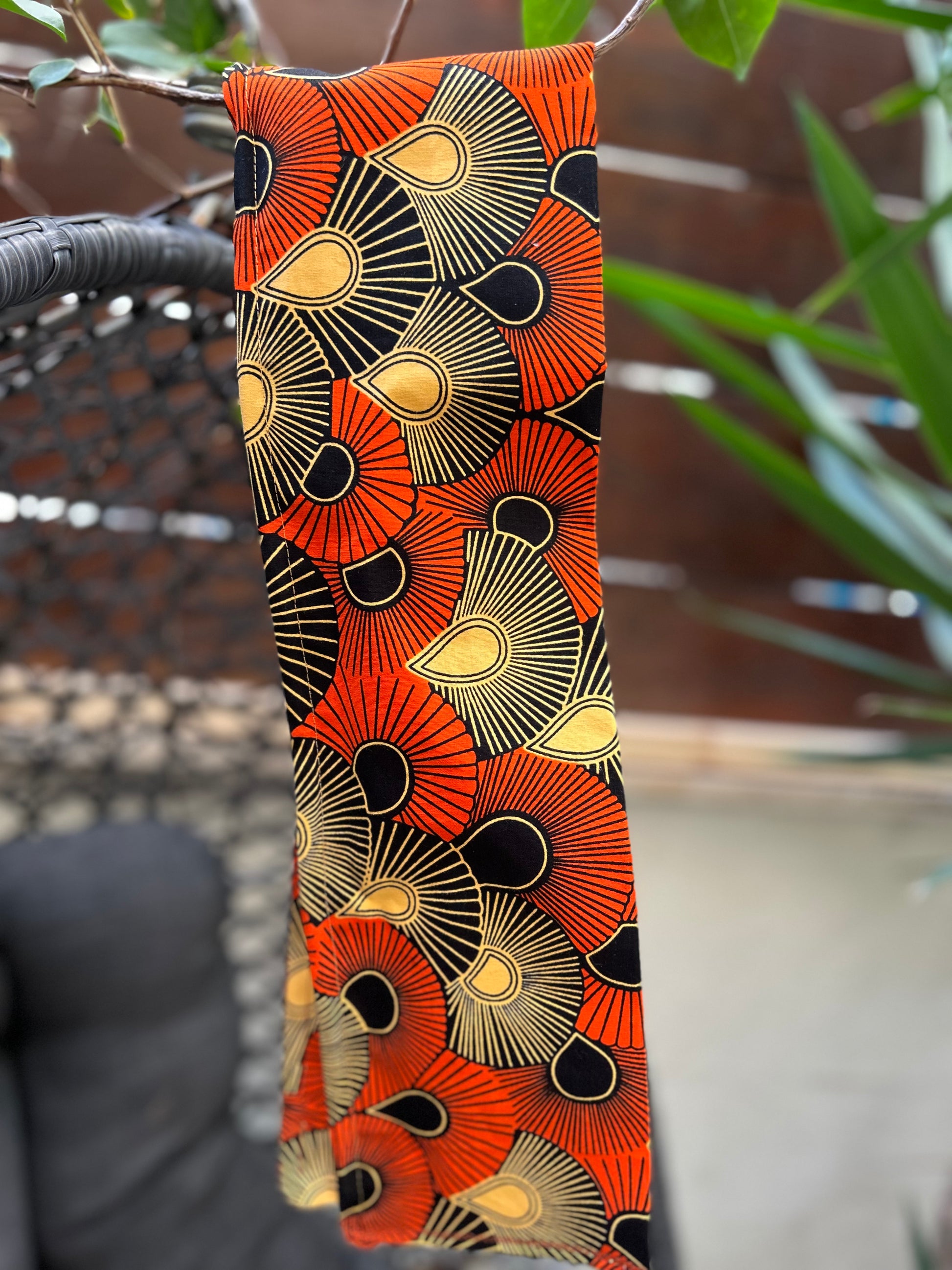 Crafted from high-quality 100% African wax cotton, this accessory is an explosion of warm colors. The pattern, evoking stylized fans or seashells, brilliantly blends the fiery shades of terracotta orange and sunny yellow against a deep, elegant black background.