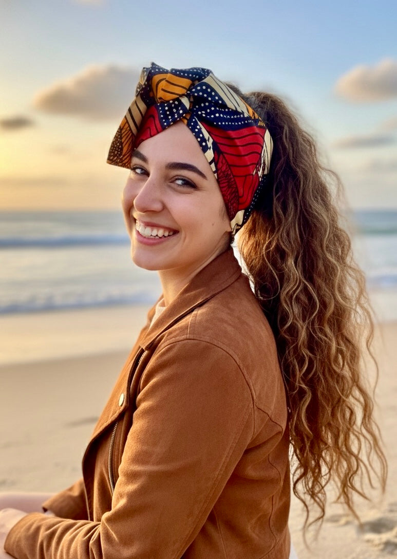 Affirmez votre style avec ce headband flexible en coton, tissu wax, un accessoire vibrant qui allie tradition et modernité. Ses motifs graphiques aux couleurs profondes – rouge, noir , crème et touches orangées lui confèrent un charme unique et authentique.
